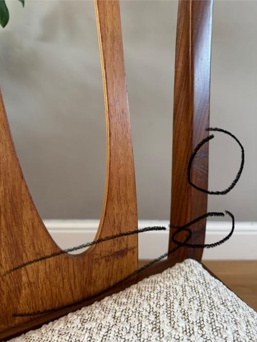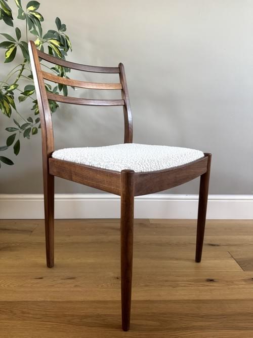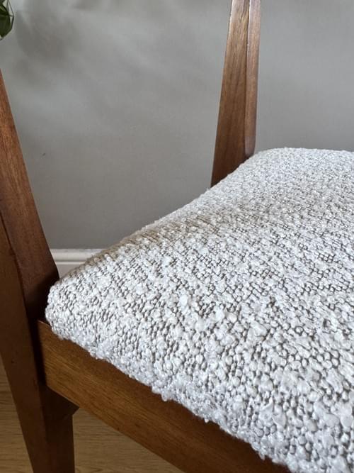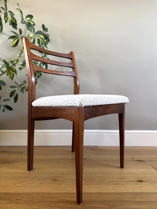 Description: Not seen before... A set of 4 complimentary teak mid-century 1970s dining chairs that have all been freshly reupholstered in a gorgeous Cotswold Boucle FR / Cream furnishing fabric, perfectly complimenting the Mid-Century Retro set.