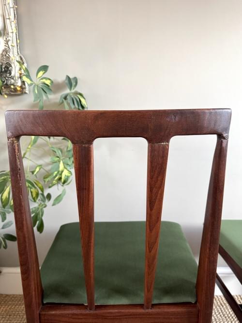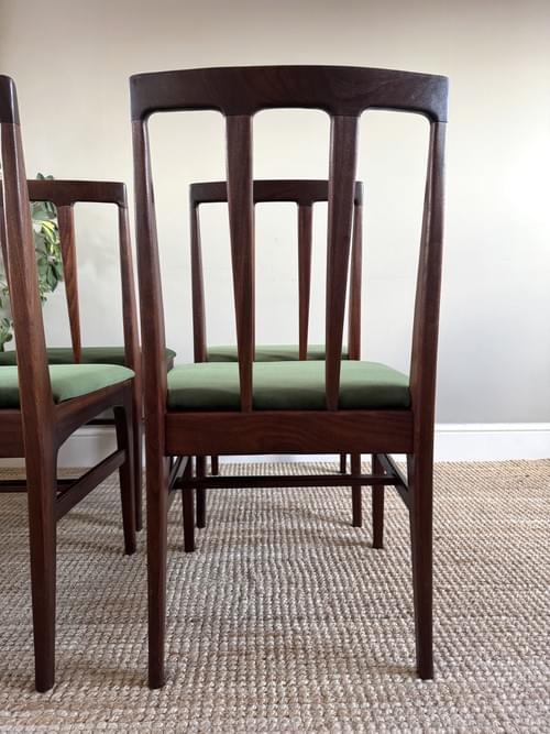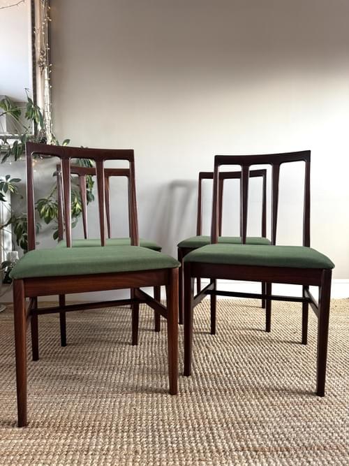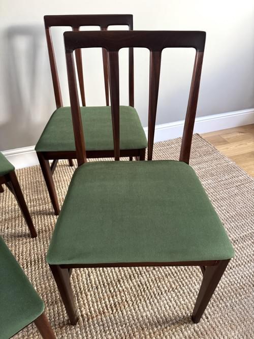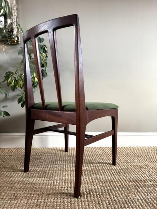 Description: Stunning and very rare, an original set of 4 Danish inspired solid Afromosia Dining Chairs from the Volnay range, designed by John Herbert for the British furniture brand Younger. Freshly reupholstered in a gorgeous fire retardant green velvet fabric. The teak elements have been cleaned.