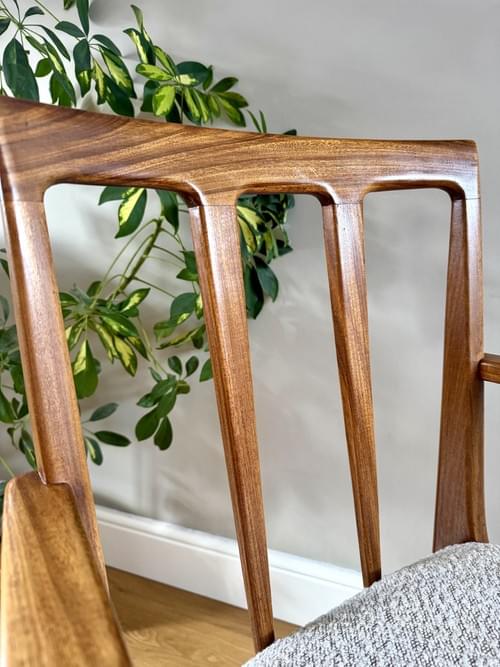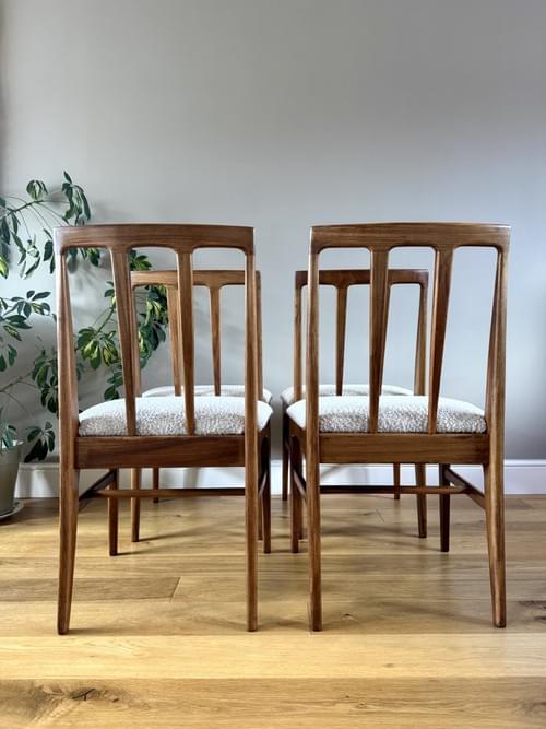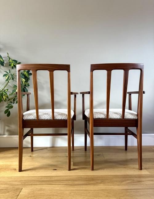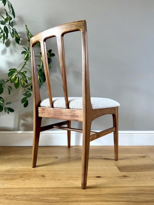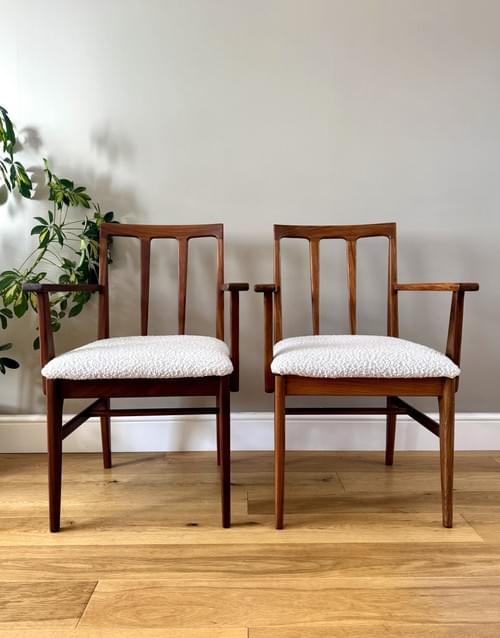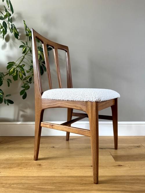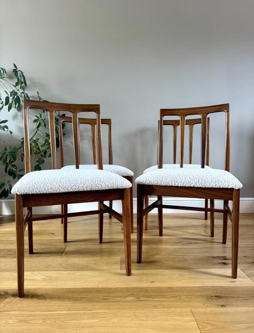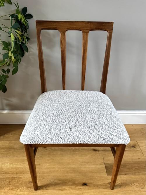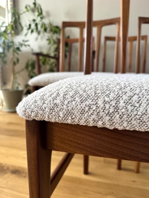 Description: Stunning and very rare, an original set of 6 Danish inspired solid Afromosia Dining Chairs from the Volnay range including two carvers, designed by John Herbert for the British furniture brand Younger. Freshly reupholstered in a gorgeous Cotswold Boucle FR / Cream furnishing fabric, perfectly complimenting the Mid-Century Retro set. The teak elements have been cleaned.