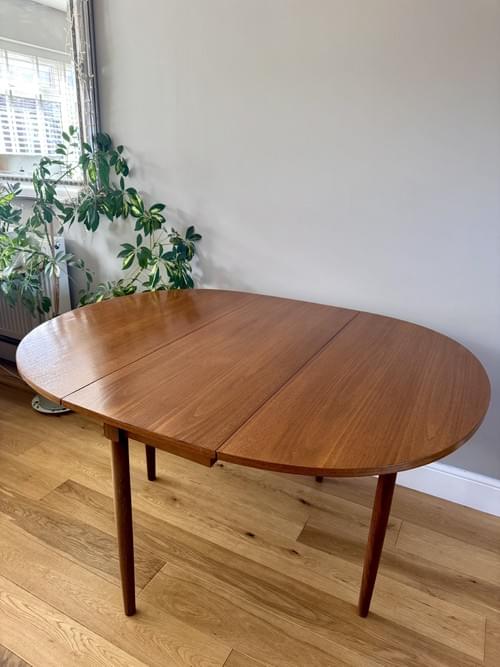 Description: Rare and highly sought after Mid-century modern and very on trend. Teak 1970s oval gate leg dining table by G Plan. Great when space is an Issue but not comprimising on style or size. The table can sit up to 8 people. NOTE: the legs do not come off.