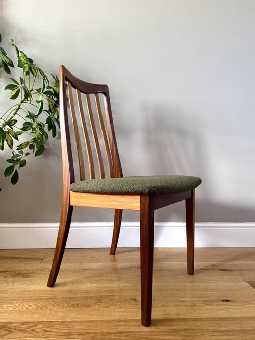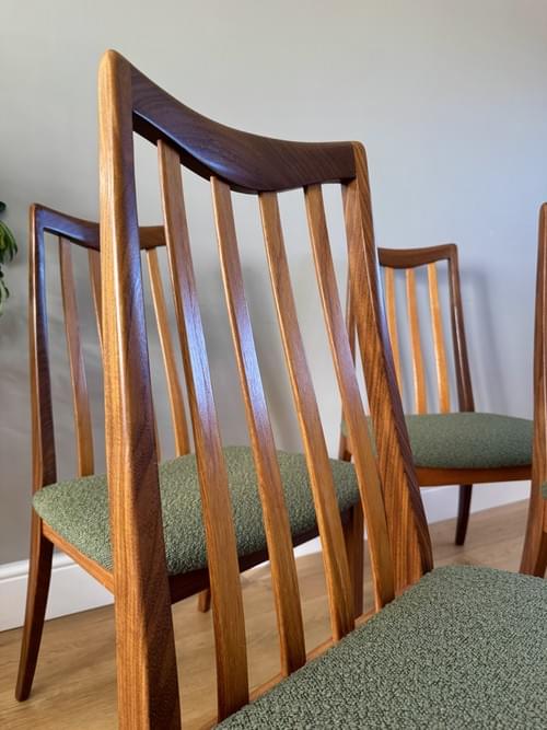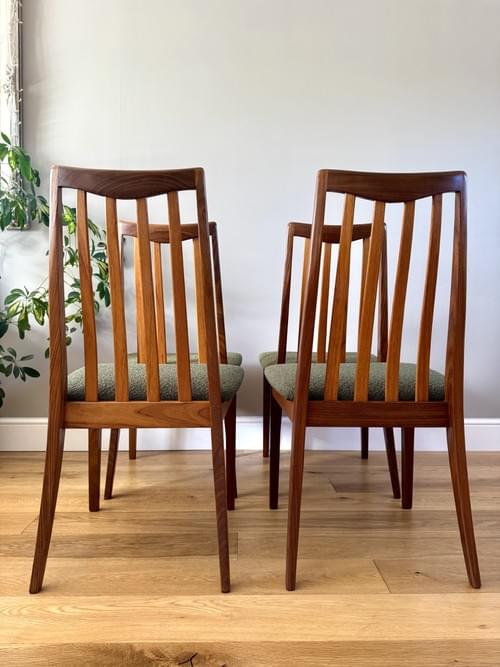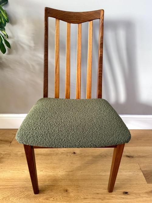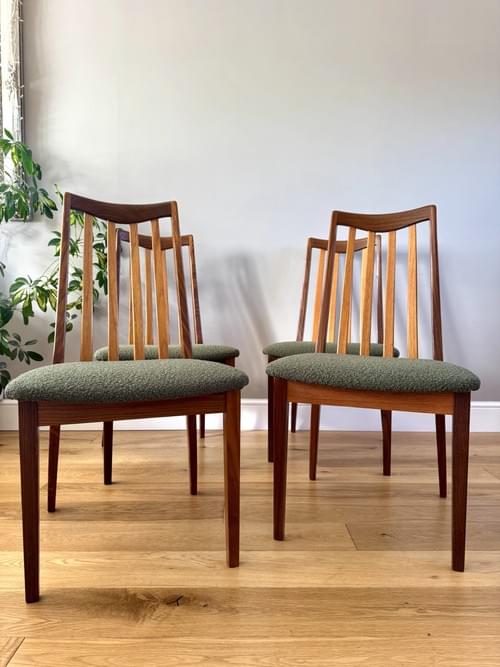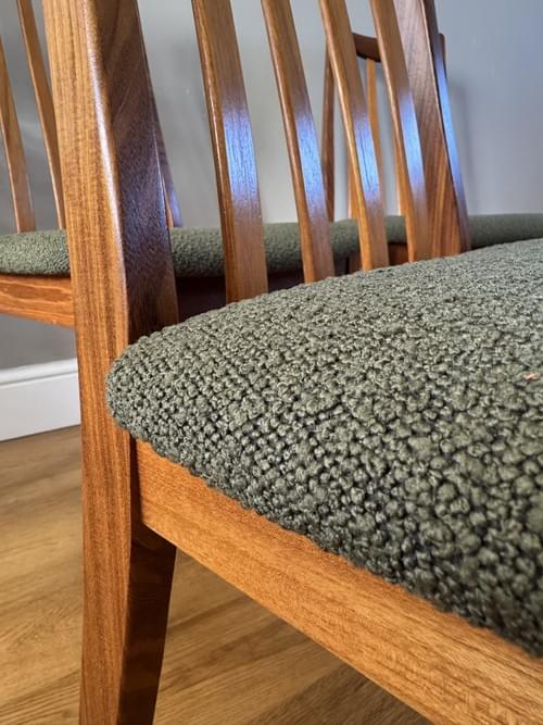 Description: A beautiful set of 4 G Plan teak dining room chairs from the Fresco Range designed by Leslie Dandy. Freshly reupholstered in a gorgeous Brockham FR boucle upholstery fabric in Lichen RRP £39.95 per metre - the colour looks amazing on Mid-Century chairs, complimenting the teak frames. For protection, the seats have been shrink-wrapped to ensure they remain fresh and clean - please remove on receipt.