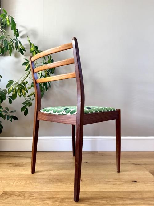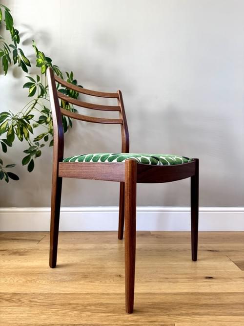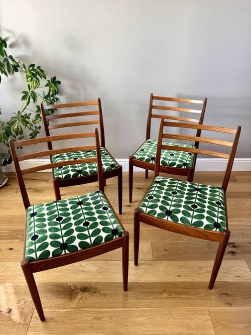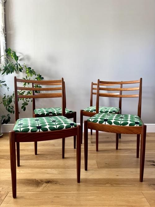 Description: Rare 1970s teak set of 4 teak dining chairs designed by Victor Wilkins for G Plan. The seats have all been freshly reupholstered in the most stunning Orla Kiely Sixties Stem green brushed velvet upholstery fabric. This fabric is not available to buy by the metre making it quite rare and the chairs one of a kind. The fabric looks amazing on Mid-Century chairs, complimenting the teak frames. The seats can be shrink wrapped to ensure they remain fresh and clean - please remove on receipt.