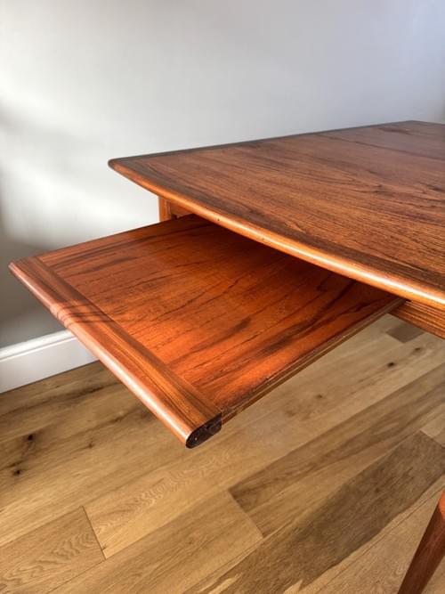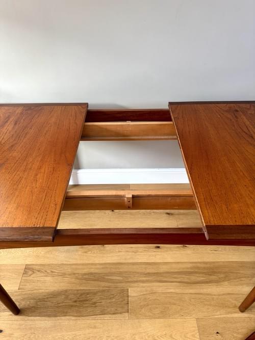 Description: A chance to grab a piece of history! Stunning and very RARE, Mid-Century extending rectangular dining table designed and made in the 1960s by Kofod Larsen for G Plan. Danish in design with shaped legs and veneer top comes with one extension panel that can cleverly stored under the table top at one end. The teak elements have been cleaned. Note: the table legs do not come off.