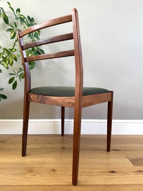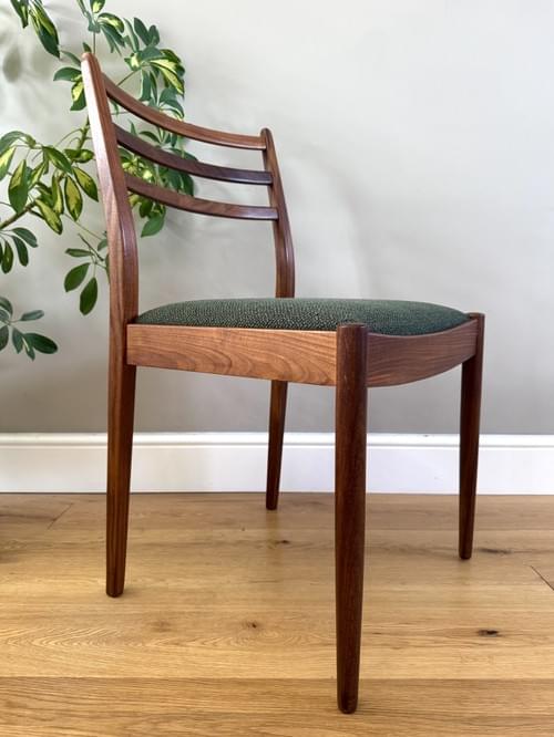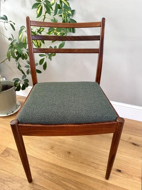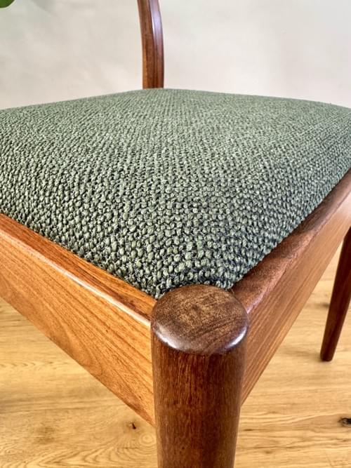 Description: A gorgeous and highly sought after set of 4 teak Mid-century modern dining chairs designed by Victor Wilkins for G Plan. Freshly reupholstered in a gorgeous Brockham FR boucle upholstery fabric in Lichen RRP £39.95 per metre - the colour looks amazing on Mid-Century chairs, complimenting the teak frames.