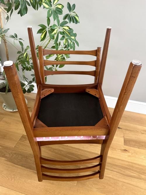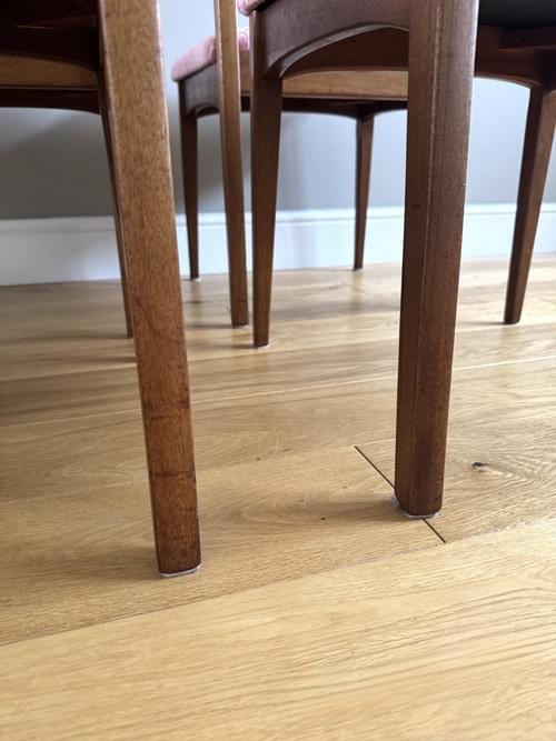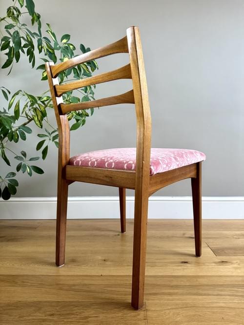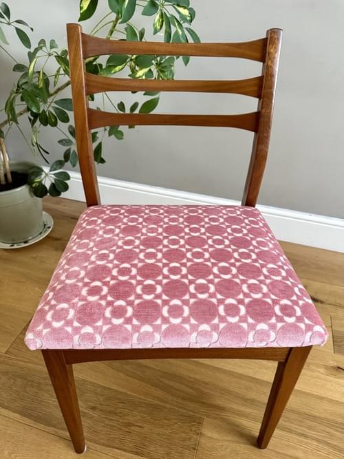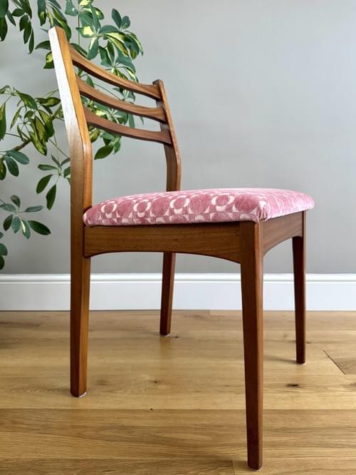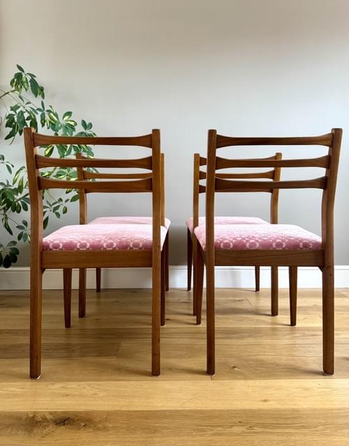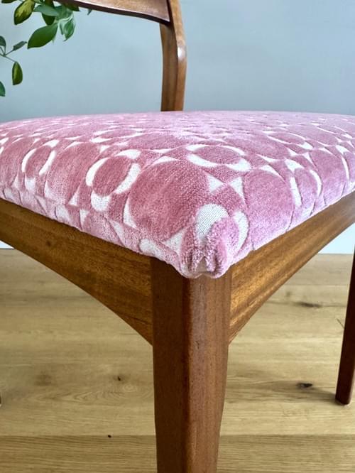 Description: A stunning set of 4 retro teak dining chairs by Jentique all freshly reupholstered in the most stunning Orla Kiely pink Retro Tile brushed velvet fabric. This fabric is not available to buy by the metre making it quite rare and the chairs one of a kind. The fabric looks amazing on Mid-Century chairs, complimenting the teak frames. The frames have all been cleaned.