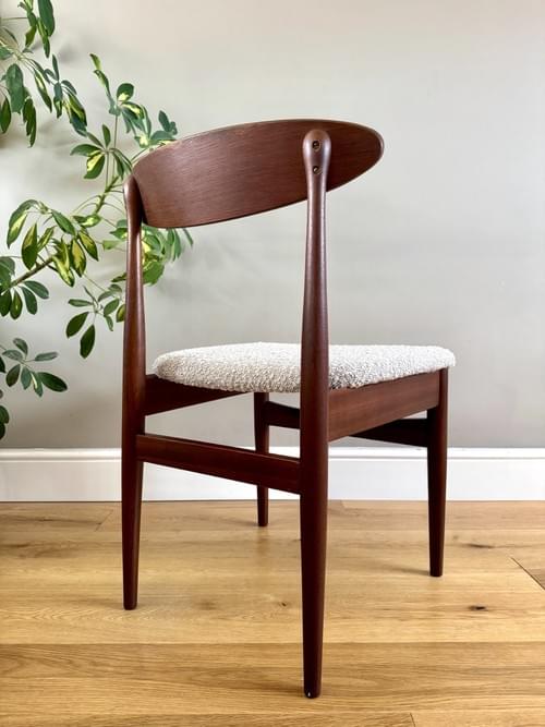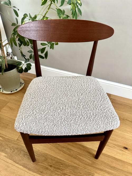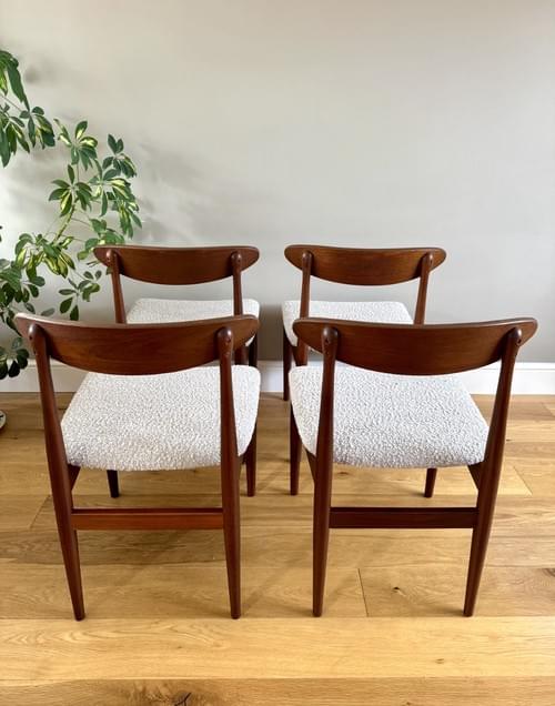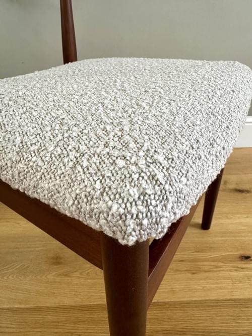 Description: A gorgeous and highly sought after set of 4 teak Mid-Century Danish Inspired Jentique dining room chairs. The seats have all been freshly reupholstered in Farnham putty coloured high quality boucle FR fabric - the fabric looks amazing on Mid-Century chairs as it really compliments teak wood. For protection, the seats can be shrink wrapped to ensure they remain fresh and clean - please remove on receipt.