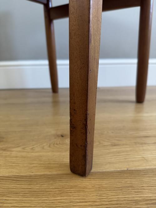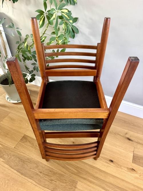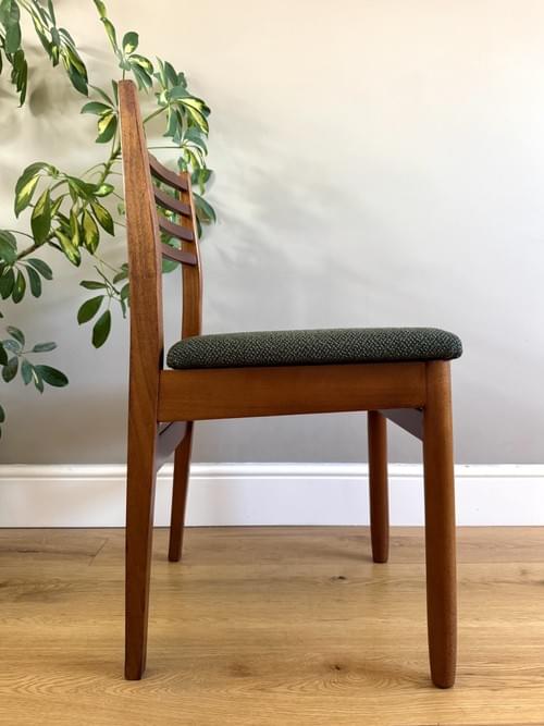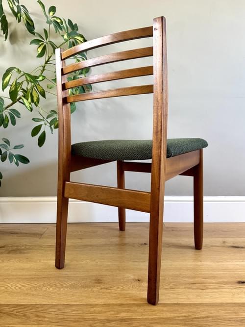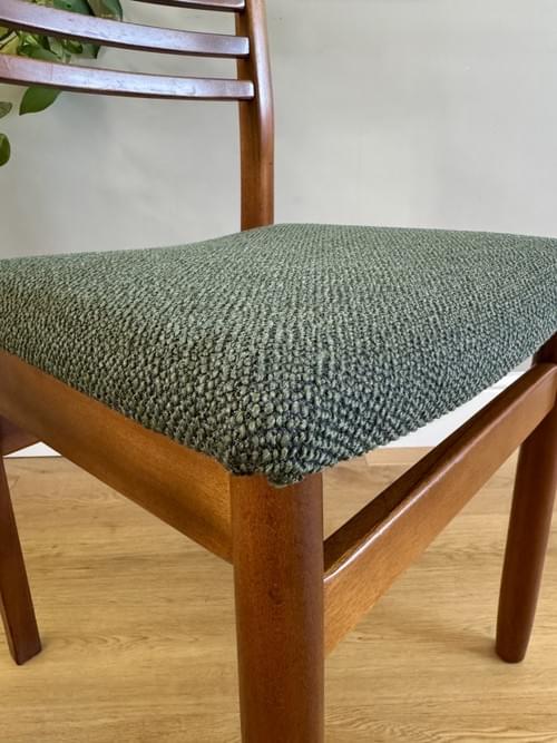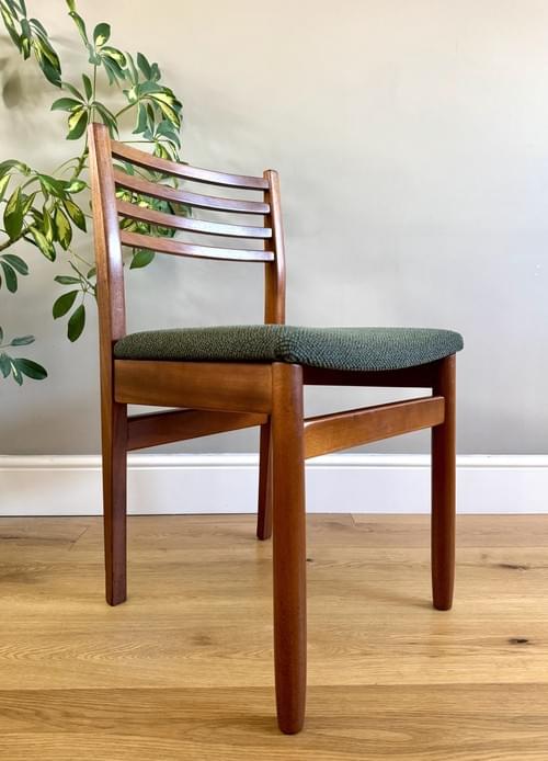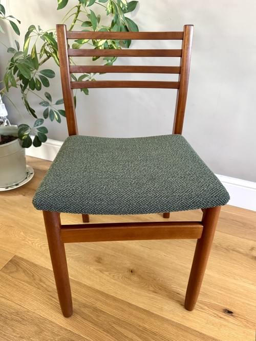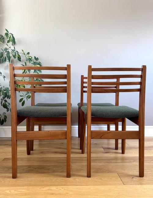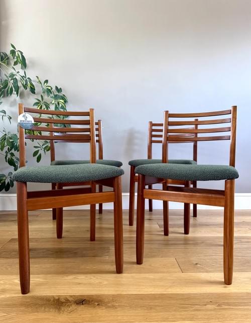 Description: A gorgeous and highly sought after set of 4 teak Mid-century modern dining chairs. Freshly reupholstered in a gorgeous Brockham FR boucle upholstery fabric in Lichen RRP £39.95 per metre - the colour looks amazing on Mid-Century chairs, complimenting the teak frames.
