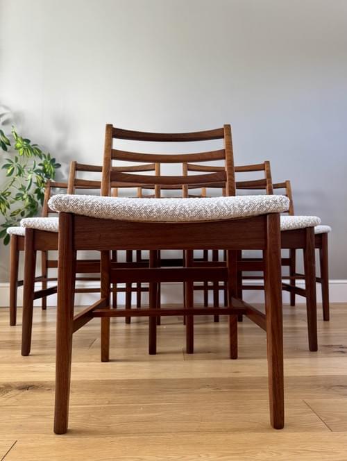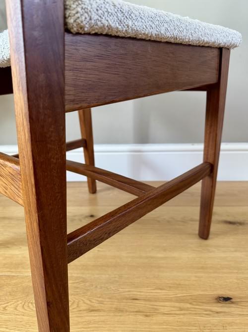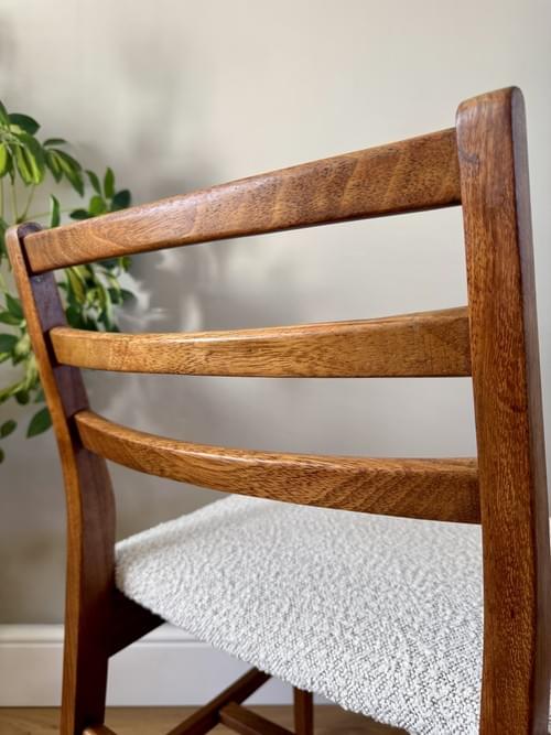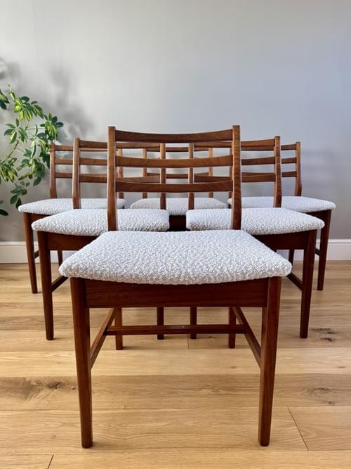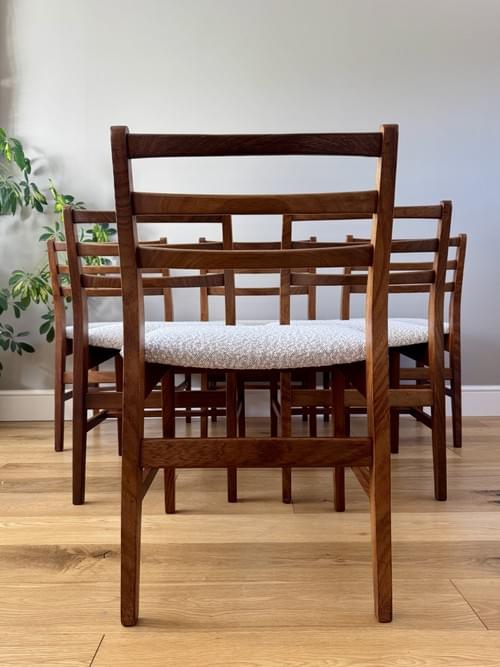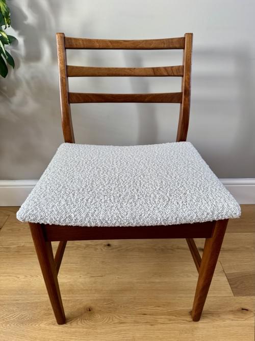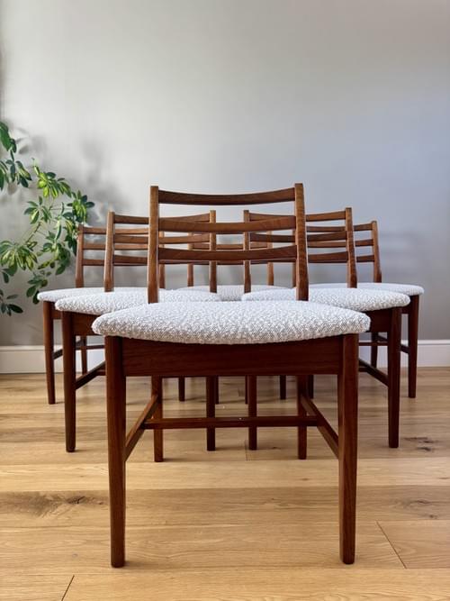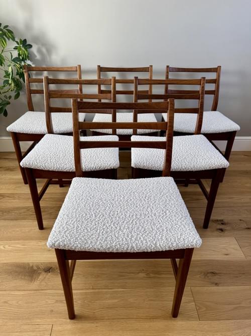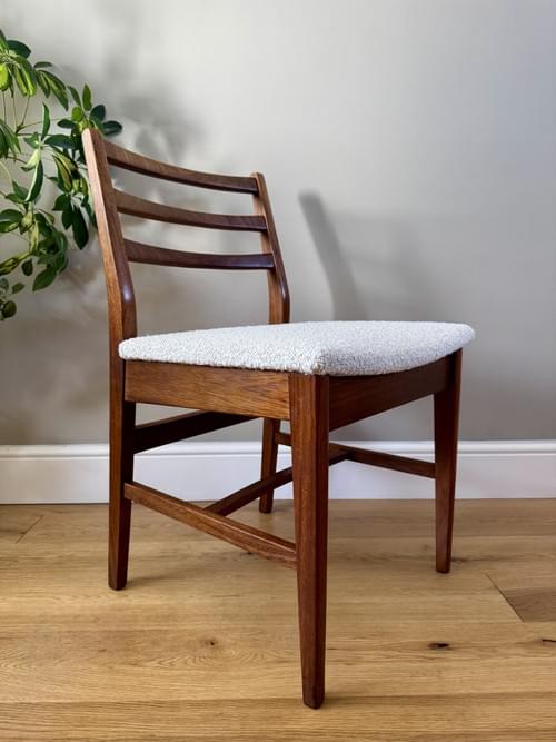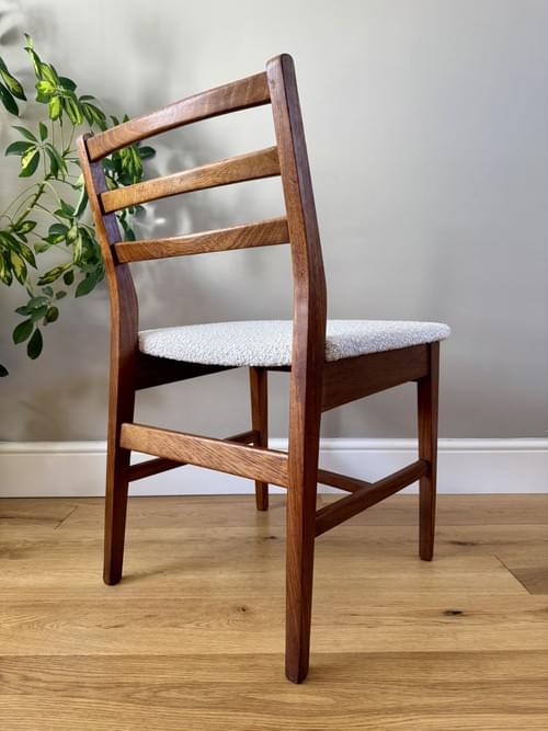 Description: Stunning and very rare, an original set of 6 Danish inspired solid Afromosia ladder back dining chairs designed by John Herbert for the British furniture brand Younger. Freshly reupholstered in a gorgeous Cotswold Boucle FR / Cream furnishing fabric, perfectly complimenting the Mid-Century Retro set. The teak elements have been cleaned.
