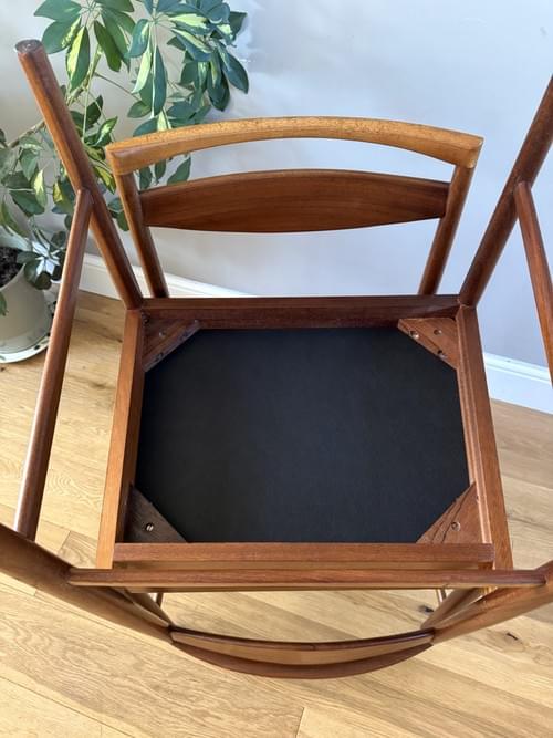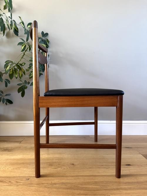 Description: A beautiful set of 4 Danish Inspired teak dining room chairs by McIntosh. The seats have been freshly reupholstered in a black faux leather material, perfectly compliments the Mid-Century/Retro frames. The teak elements have been cleaned and re-oiled. The seats will be shrink wrapped for transit - please remove on receipt.