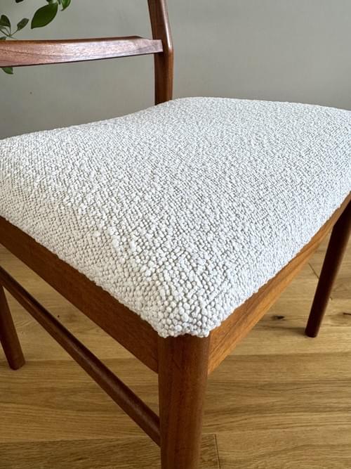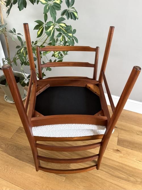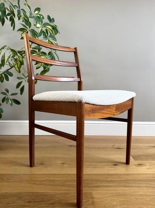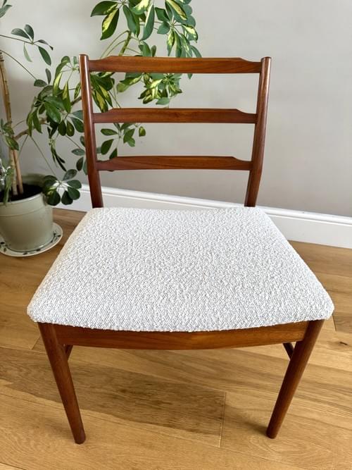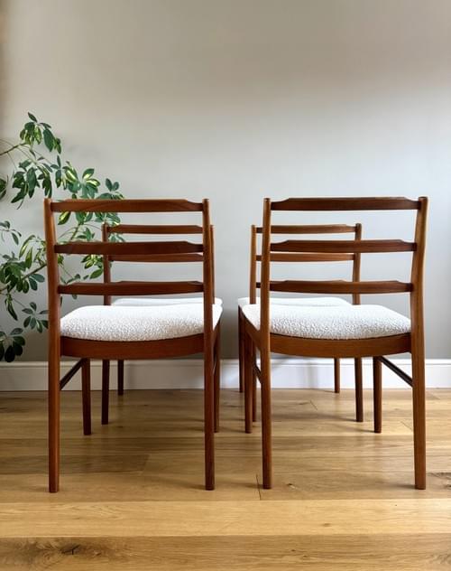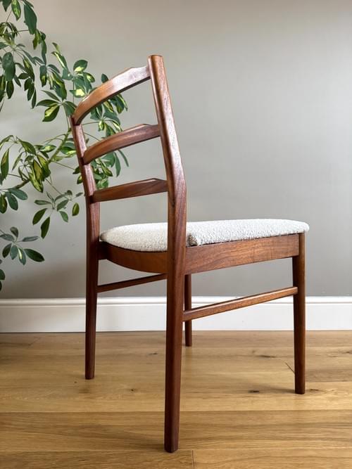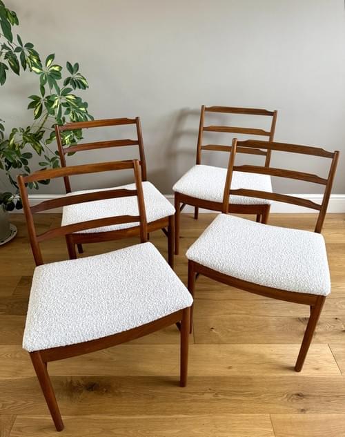 Description: Rare and highly sought after set of four Mid-century modern solid teak ladder back dining room chairs. The seats have been freshly reupholstered in a gorgeous stone coloured fire retardant boucle fabric, perfectly complimenting the Mid-Century retro frames. The teak elements have been cleaned. The seats can be shrink wrapped to protect during transit - please remove on receipt.
