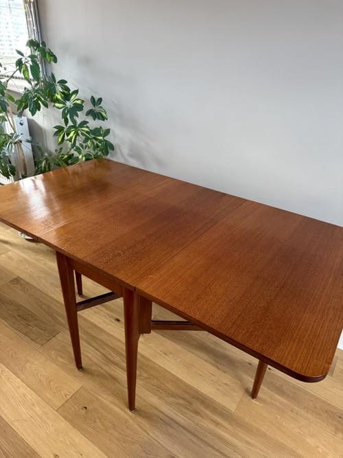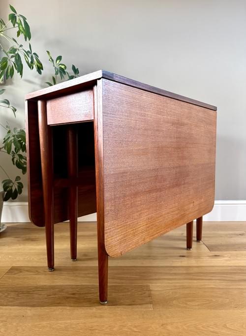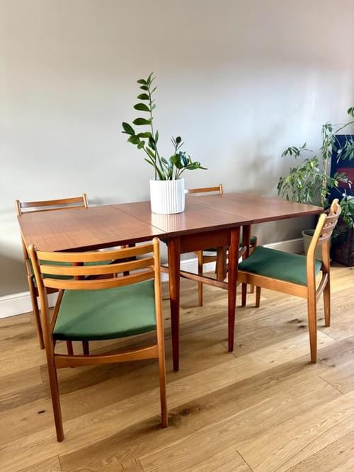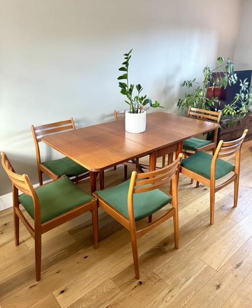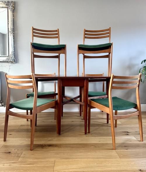 Description: Chairs very similar in style to the G Plan chairs degined by Victor Wilkins. Set of 6 teak dining chairs all freshly reupholstered in a gorgeous fire retardant green upholstery velvet - the colour looks amazing on Mid-Century chairs, complimenting the teak frames. Paired with a Mid-Century modern teak rectangular shaped gate-leg table. A great space dining table that can be stored away when not needed, easy to get through small hallways and entrances making this gorgeous table a fantastic option. The set has been cleaned.