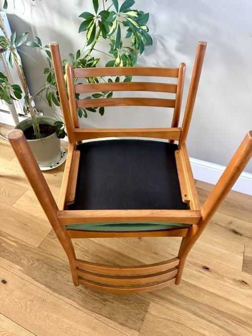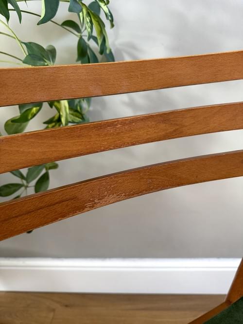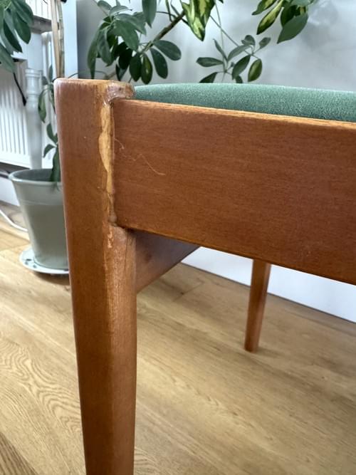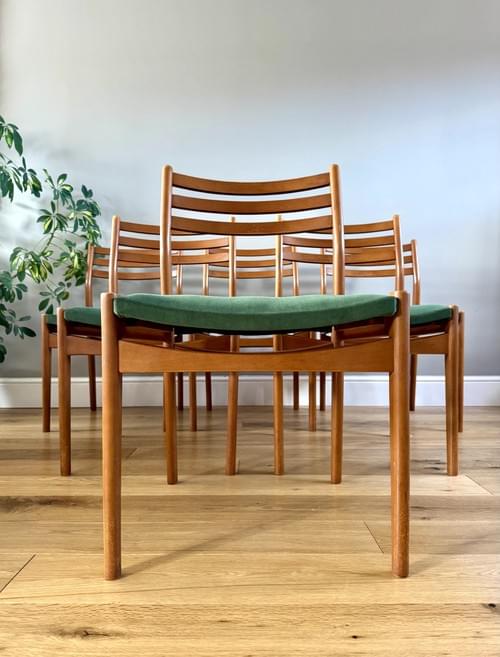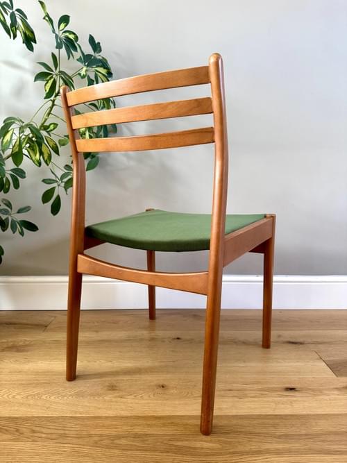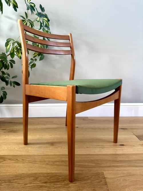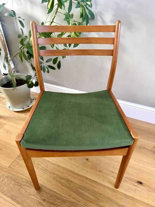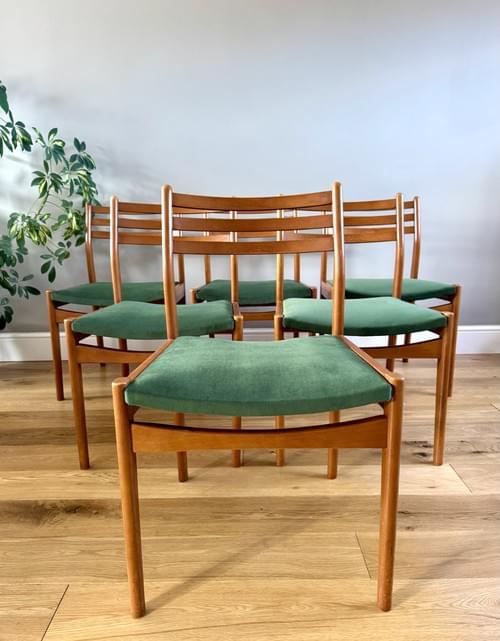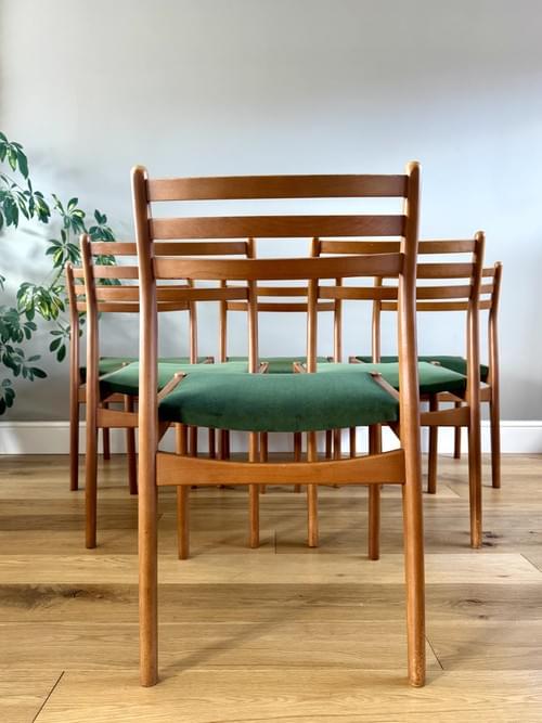Description: Very similar in style to the G Plan chairs degined by Victor Wilkins. Set of 6 teak dining chairs all freshly reupholstered in a gorgeous fire retardant green upholstery velvet - the colour looks amazing on Mid-Century chairs, complimenting the teak frames. The frames have all been cleaned.