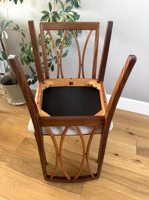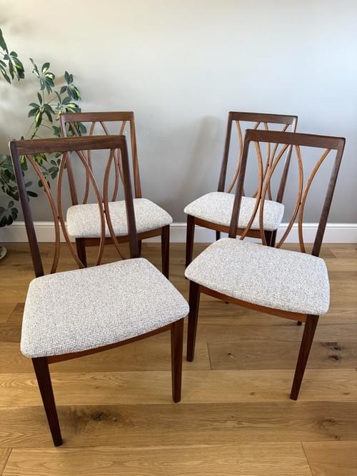 Description: A beautiful set of 4 G Plan solid teak dining room chairs from the Fresco Range with their unusual curved back frames. The seats have all been freshly reupholstered in a textured soft beige FR upholstery fabric from John Lewis - the fabric looks amazing on Mid-Century chairs as it really compliments teak wood. For protection, the seats can be shrink wrapped to ensure they remain fresh and clean - please remove on receipt.
