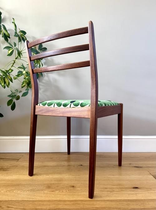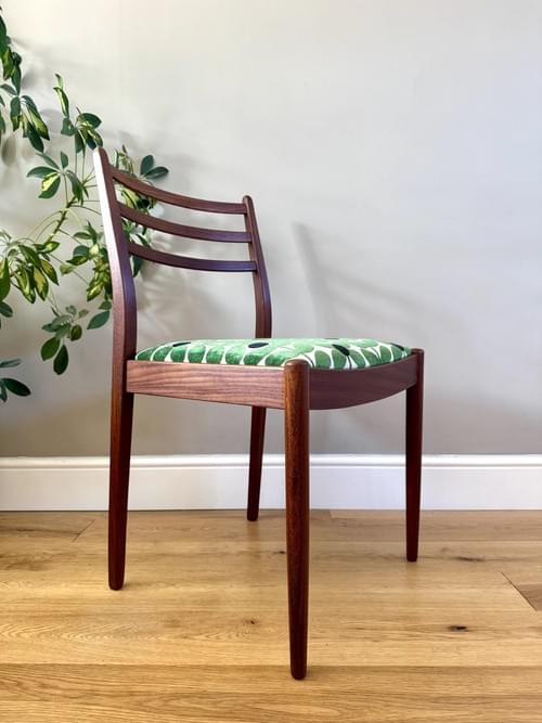 Description: Rare 1970s teak set of 4 teak dining chairs designed by Victor Wilkins for G Plan. The seats have all been freshly reupholstered in the most stunning Orla Kiely Sixties Stem green brushed velvet upholstery fabric. This fabric is not available to buy by the metre making it quite rare and the chairs one of a kind. The fabric looks amazing on Mid-Century chairs, complimenting the teak frames. The seats can be shrink wrapped to ensure they remain fresh and clean - please remove on receipt.