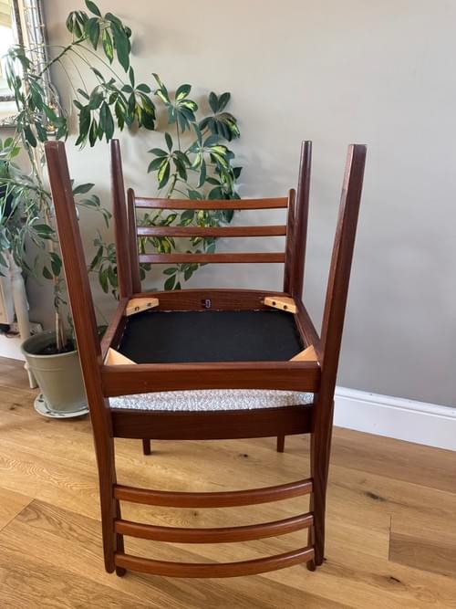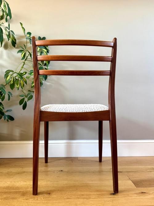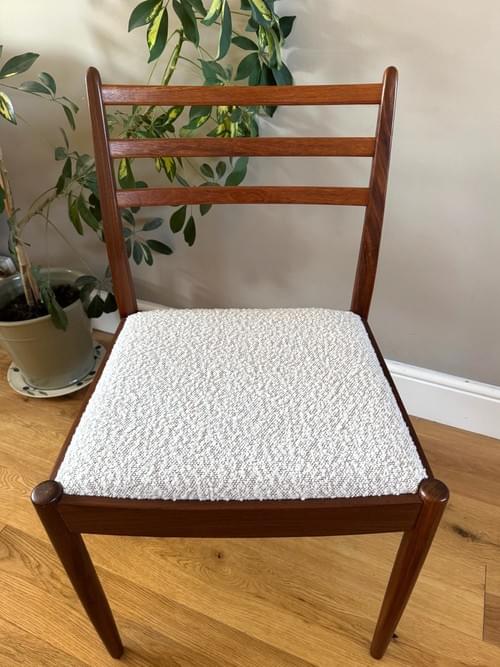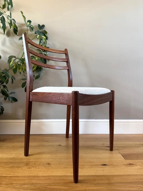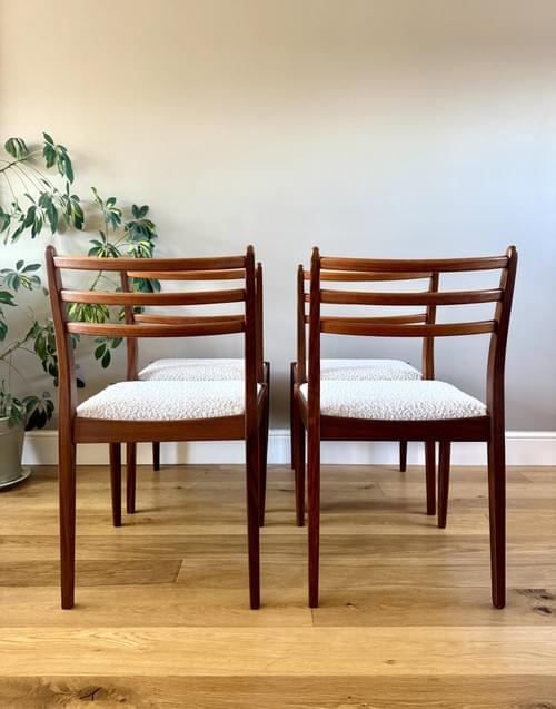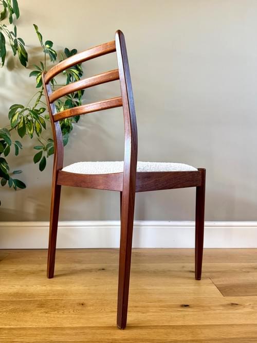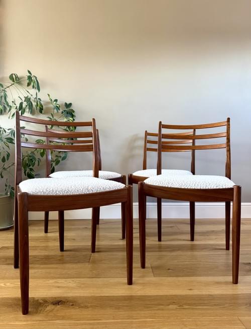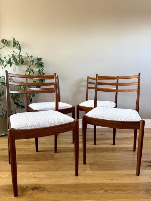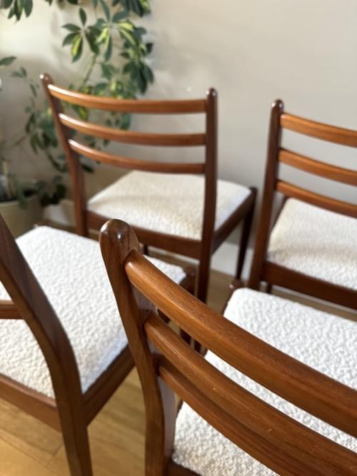 Description: A gorgeous and highly sought after set of 4 teak Mid-century modern dining chairs designed by Victor Wilkins for G Plan. Freshly reupholstered in a gorgeous Cotswold Boucle FR / Cream furnishing fabric, perfectly complimenting the Mid-Century Retro set.