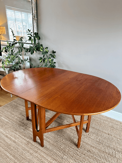 Description: Mid-Century modern teak oval shaped gate-leg table by Jentique. A great space dining table that can be stored away when not needed, easy to get through small hallways and entrances making this gorgeous table a fantastic option.