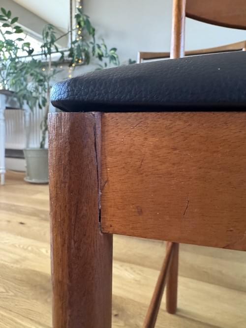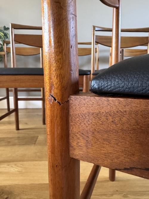 Condition: There are age related dinks - please see ALL photos plus video available on request. One chair has had a previous repair, the frame is solid. These flaws have been reflected in the asking price.