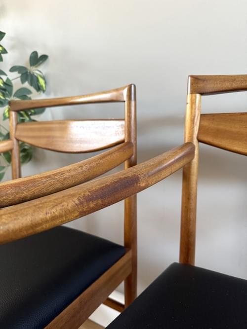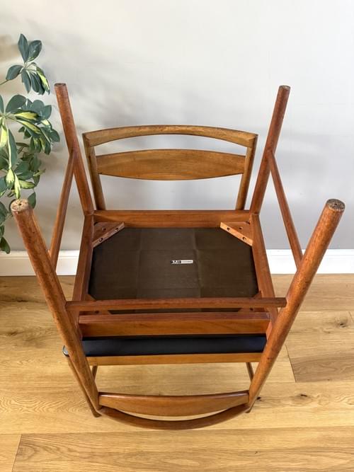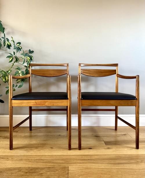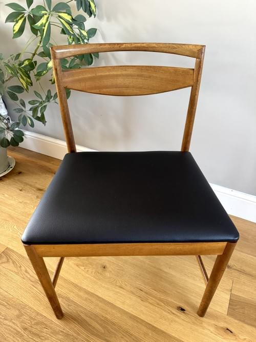Description: A set of 6 Danish Inspired teak dining room chairs by McIntosh including 2 carvers (chairs with arms). The seats have been freshly reupholstered in a black faux leather material and lined with a fire retatrant lining, perfectly complimenting the Mid-Century/Retro frames. The teak elements have been cleaned and re-oiled.