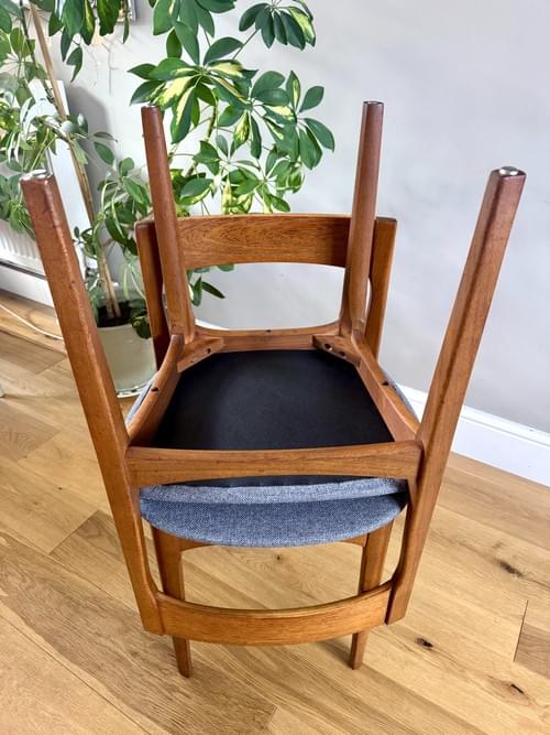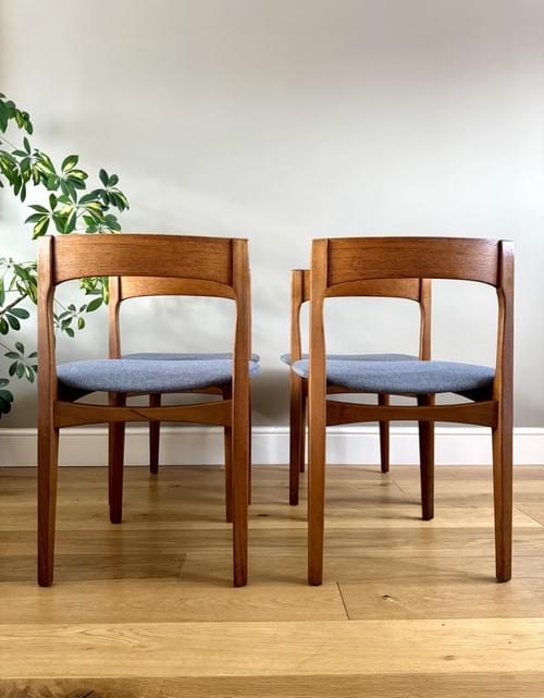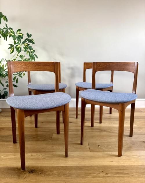 Description: A rare and highly sought after set of 4 teak dining room chairs by Nathan, perfect to pair with a rounded dining table as the backrests have a curve to the shape of the rounded side of the table. The chairs have been freshly reupholstered in a gorgeous steel grey textured fire retardant John Lewis fabric. The teak elements have been cleaned.