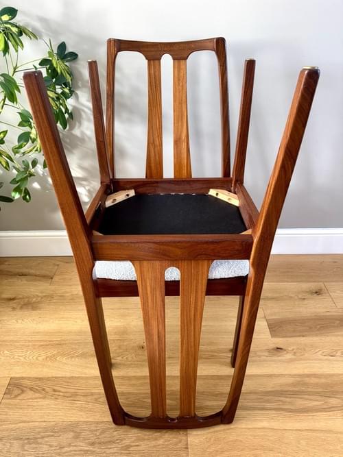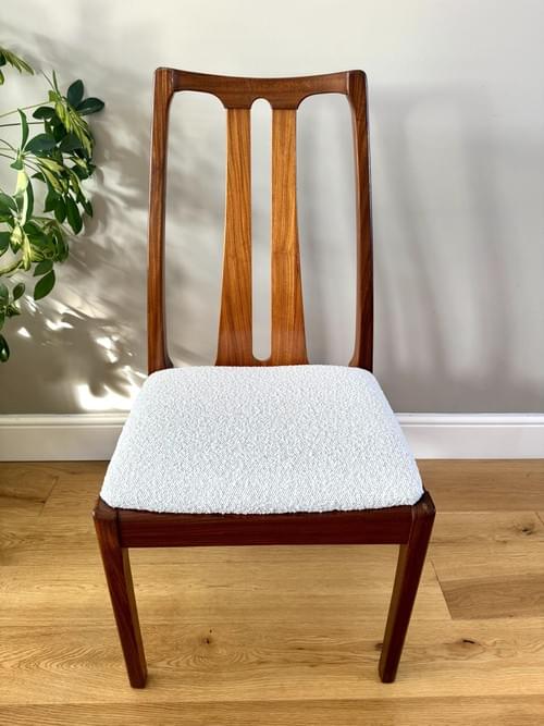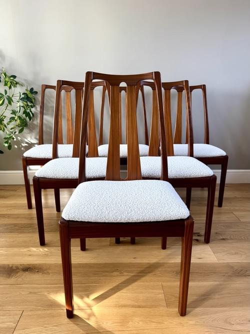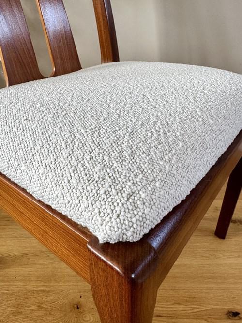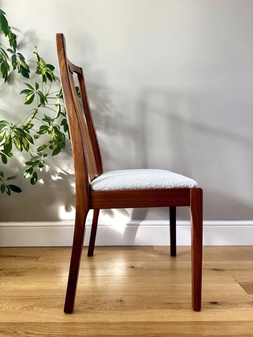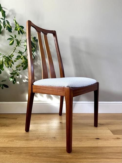 Description: A set of 6 teak dining room chairs by Nathan. The chairs have been freshly reupholstered in a gorgeous marshmallow fire retardant boucle John Lewis fabric. The fabric looks amazing on Mid-Century chairs, complimenting the teak frames. For protection, the seats can be shrink-wrapped to ensure they remain fresh and clean - please remove on receipt.