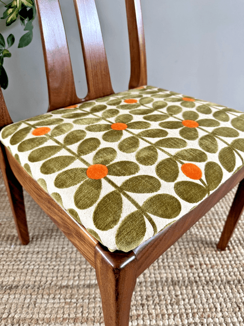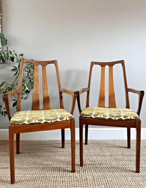 Description: A set of 6 teak dining room chairs including two carvers by Nathan. Freshly reupholstered in the most stunning Orla Kiely Sixties Stem fawn brushed velvet upholstery fabric. This fabric is not available to buy by the metre making it quite rare and the chairs one of a kind. The fabric looks amazing on Mid-Century chairs, complimenting the teak frames. For protection, the seats can be shrink-wrapped to ensure they remain fresh and clean - please remove on receipt.