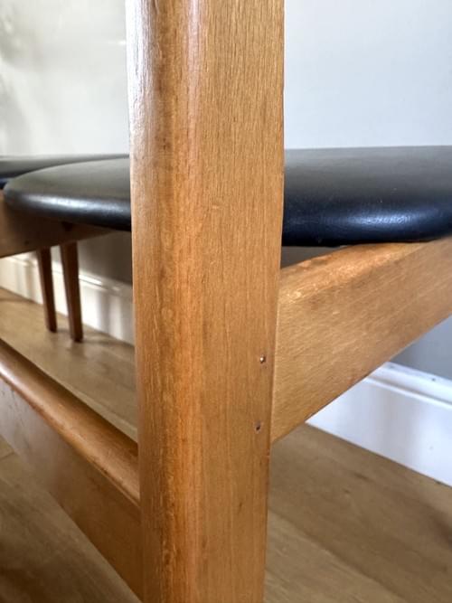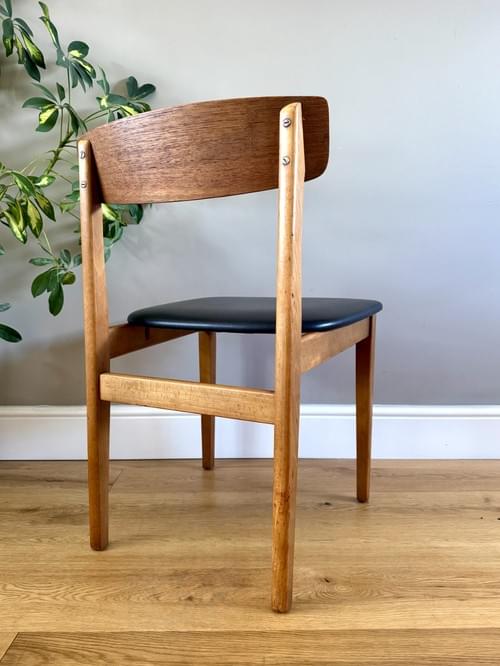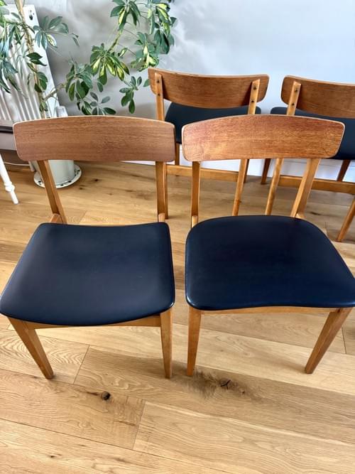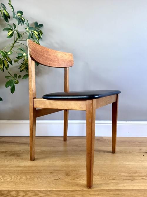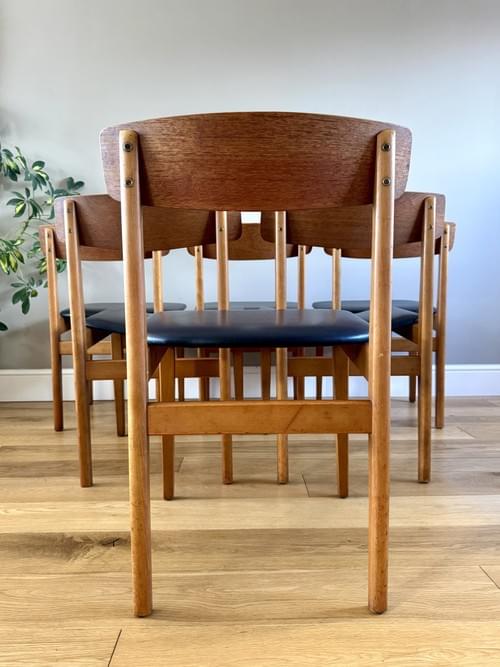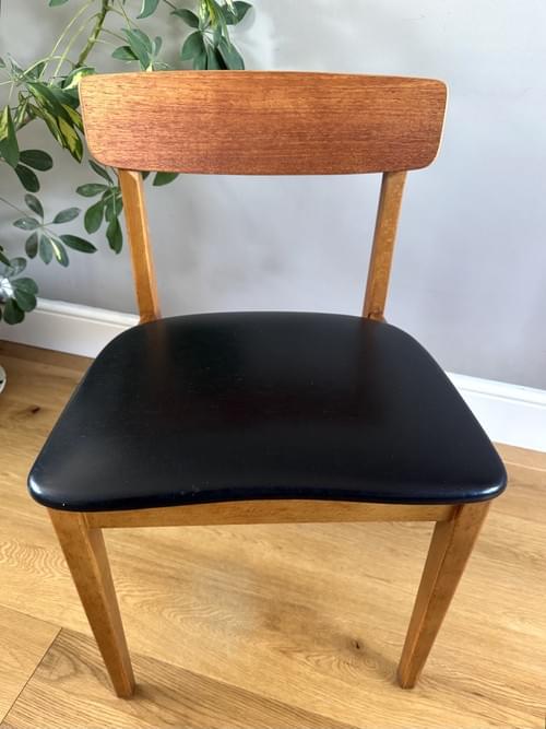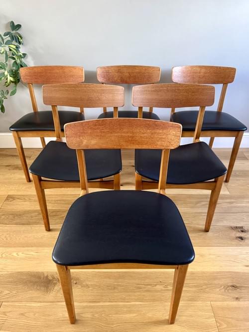 Description: An original 1960s/70s set of 6 teak curved veneer back dining chairs in two very similar styles (see pic) The seats have their original black vinyl coverings. The frames have all been cleaned.
